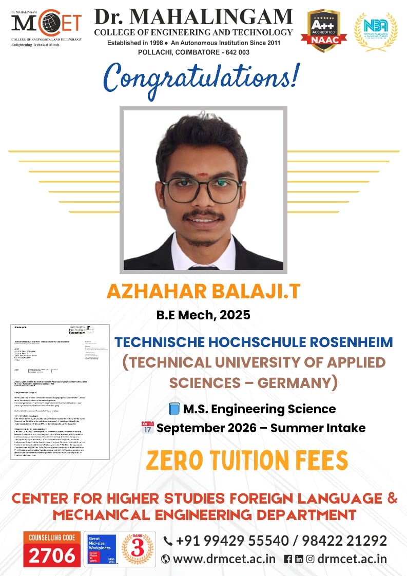 Mr. Azhahar Balaji T (Class of 2025 - B.E. Mechanical) has secured admission to the Technical University of Applied Sciences, Germany, for the M.S. Engineering Science program... Read more