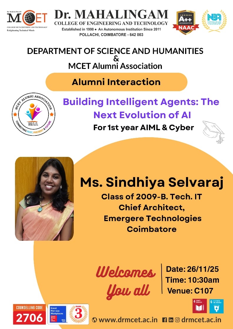 Alumni Interaction on ‘Building Intelligent Agents: The Next Evolution of AI’ by Ms. Sindhiya Selvaraj (Class of 2009 – B.Tech. IT), Chief Architect, Emergere Technologies, Coimbatore, organized by the Department of Science and Humanities & MCE.. Read more