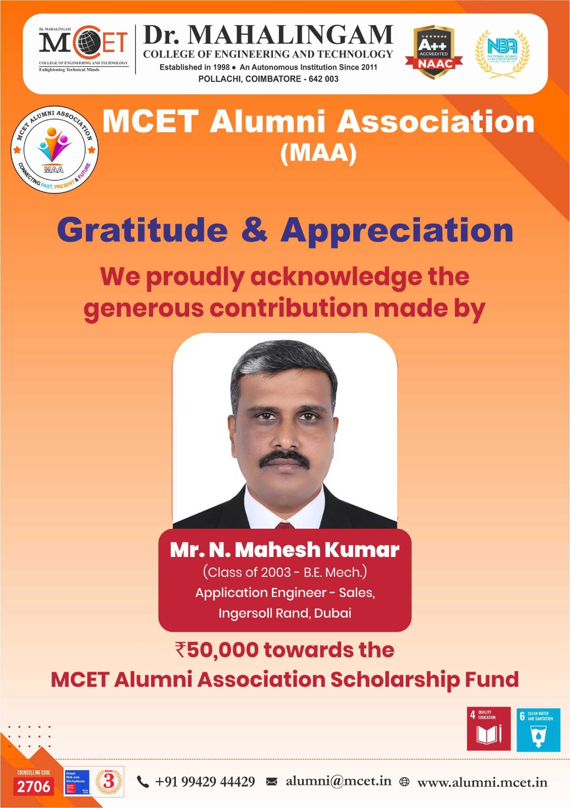 We proudly acknowledge the generous contribution made by Mr. N. Mahesh Kumar (Class of 2009 - BE. Mech.).. Read more