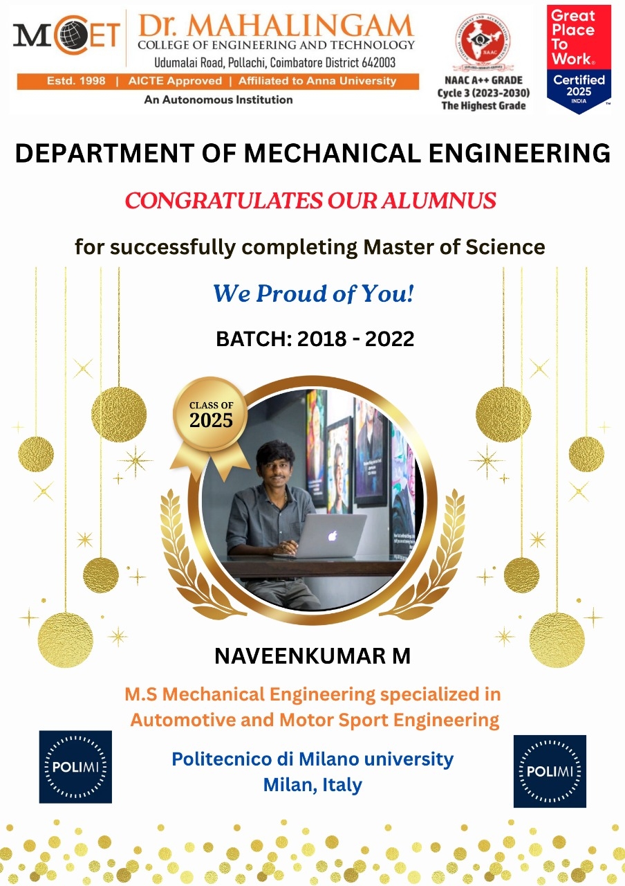 Mr. Naveenkumar M (Class of 2022 – B.E. Mechanical) has successfully completed the Master of Science in Mechanical Engineering (Specialization: Automotive and Motorsport Engineering) at Politecnico di Milano University, Milan, Italy... Read more